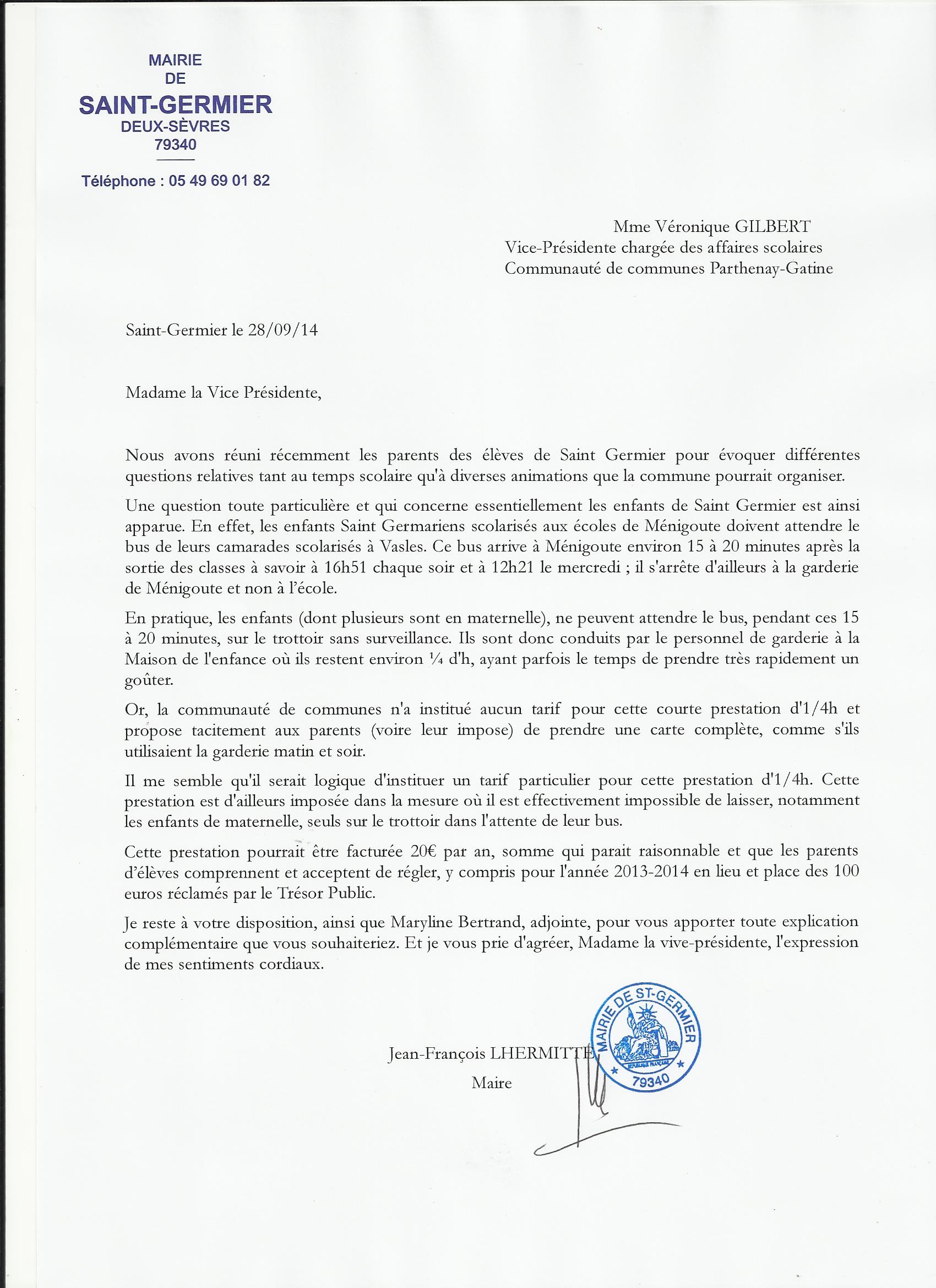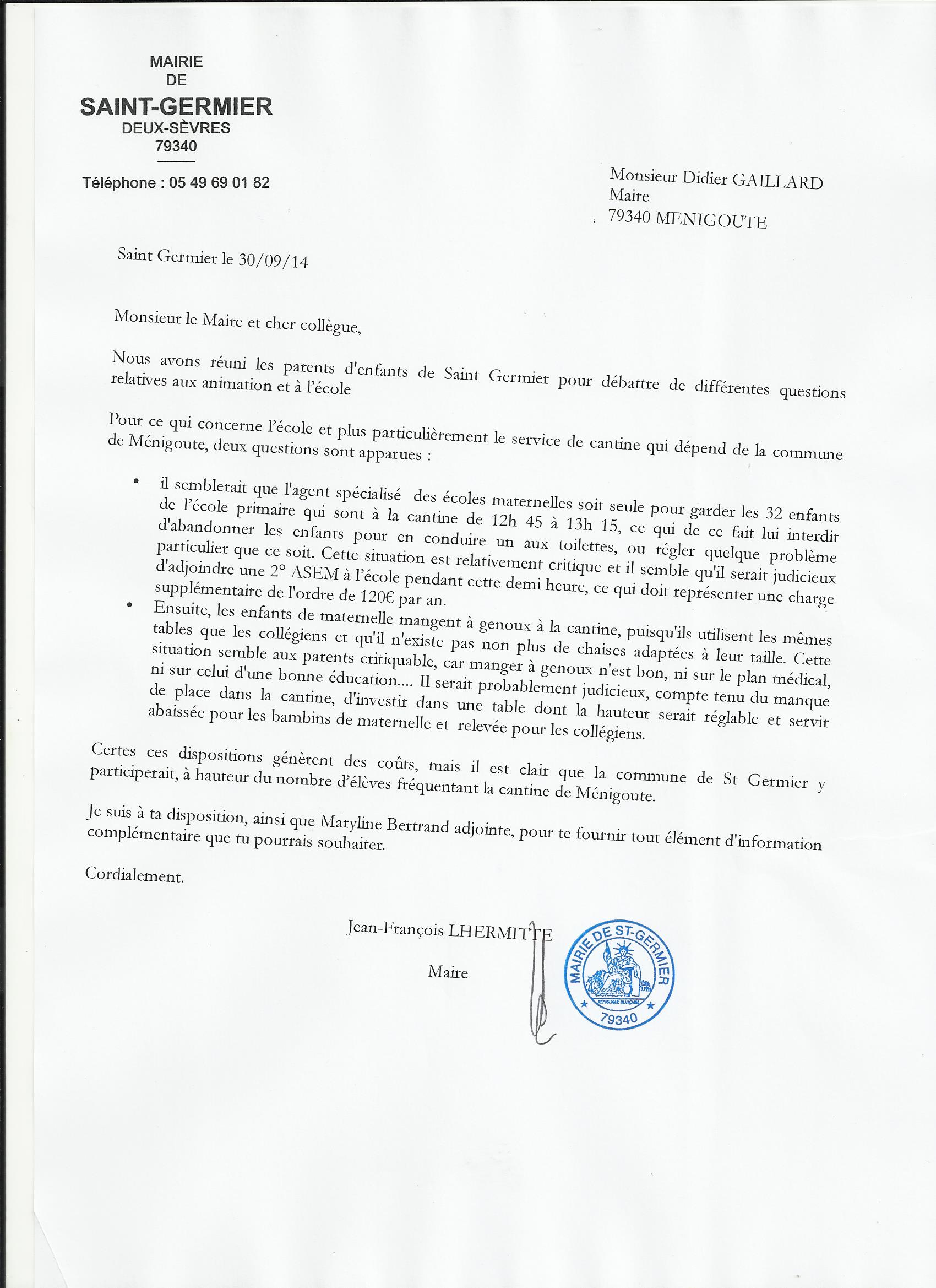 À la suite de cette réunion et pour aborder certains questionnements des parents au niveau de la garderie et de la cantine, il a été convenu que M. le Maire interpellerait les services compétents de la Communauté de Communes Parthenay Gâtine ainsi que de la commune de Ménigoute. Les lettres sont consultables ici :