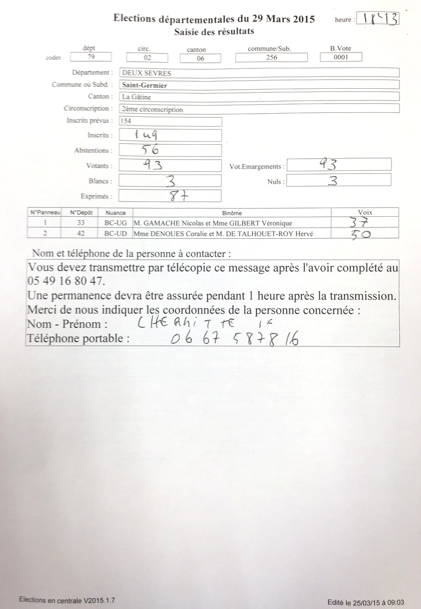 Quatre-vingt-treize Saint Germariens ont fait le déplacement aujourd’hui, dimanche 29 Mars, pour le deuxième tour des Élections Départementales, contre 101 dimanche dernier. Les résultats sont les suivants :