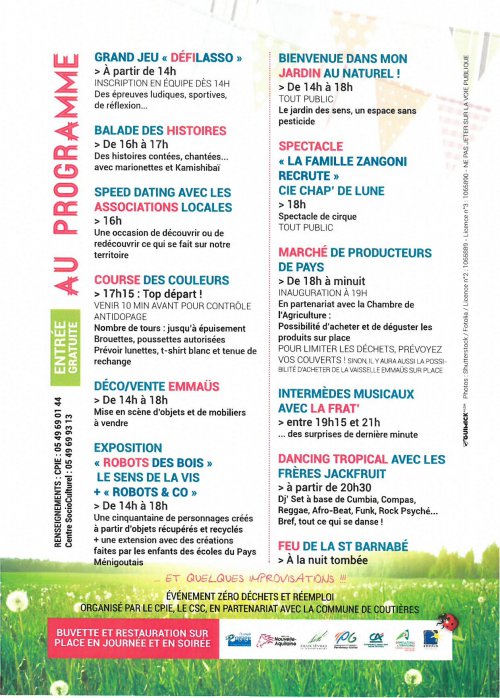 Au programme : course des couleurs, lectures contées-chantées, grand jeu de piste, vente/déco Emmaüs, marché de producteurs de Pays co-organisé avec la Chambre de l’Agriculture, et une programmation culturelle.