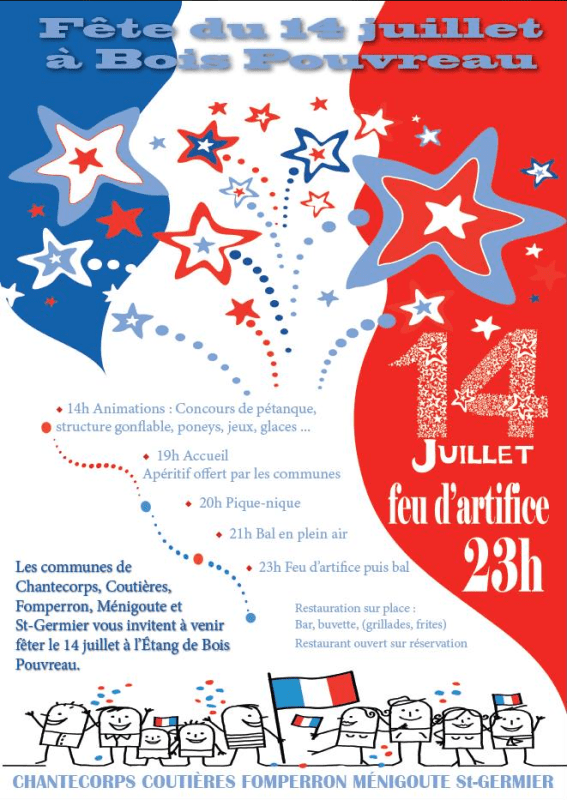 Pour la 2ème année consécutive, les communes de Fomperron, Chantecorps, Coutières, Ménigoute et Saint-Germier s’unissent pour les festivités du 14 Juillet. Le public est attendu sur le site de Bois Pouvreau où se tiendront des jeux et des animations l’après-midi. Un apéritif sera offert par les cinq communes vers 19h et sera suivi d’un pique-nique sorti du sac.
