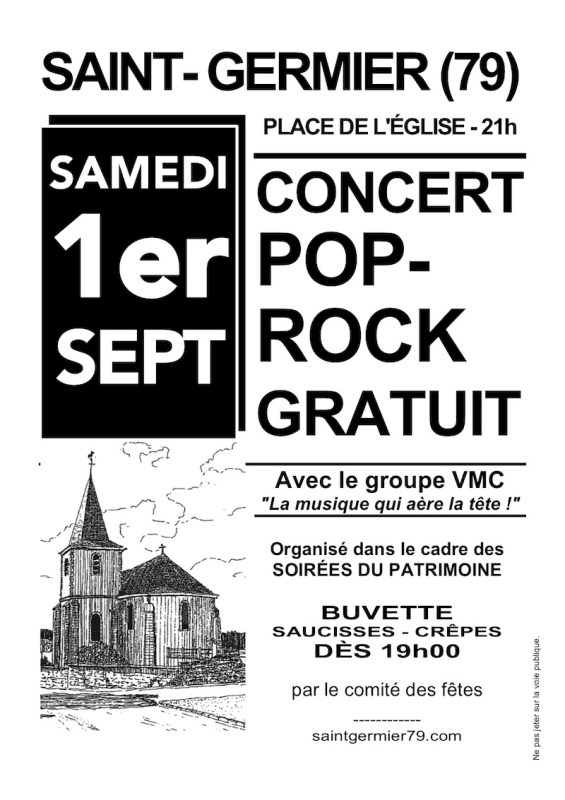 Saint-Germier vous invite à prolonger l’été dans la musique et la bonne humeur ! Le village accueille le groupe VMC dans le cadre des Soirées du Patrimoine de Gâtine samedi 1er Septembre dès 21h sur la place de l’église. C’est donc l’église qui sera mise en lumières par les équipes du CARUG et qui servira de décor au concert Pop-Rock. L’accès au monument sera exceptionnellement ouvert pour permettre aux visiteurs de découvrir notamment sa cloche classée aux Monuments Historiques.