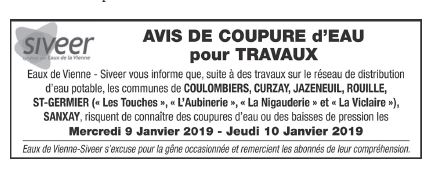 Eaux de Vienne – Siver informe que suite à des travaux sur le réseau de distribution d’eau potable, les communes de Coulombiers, Curzay, Jazeneuil et certains hameaux de Saint-Germier risquent de connaître des coupures d’eau ou des baisses de pression aujourd’hui et demain, jeudi 10 Janvier 2019.