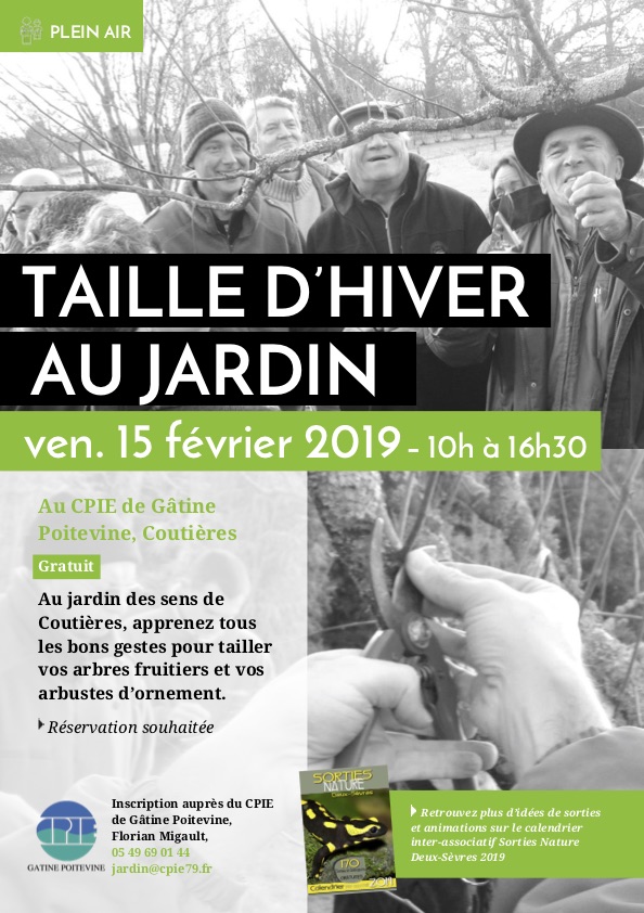 Le Centre Permanent d’Initiatives pour l’Environnement (CPIE) Gâtine Poitevine propose comme l’an passé un atelier « Taille d’hiver » aux jardins des sens à Coutières le vendredi 15 février de 10h à 16h30. La matinée commencera en salle pour se mettre au clair sur la taille des fruitiers. Elle sera suivie d’un pique-nique tiré du sac puis d’une après-midi sur le terrain en deux groupes tournants : l’un sur les pommiers et l’autre sur les rosiers et autres arbustes ornementaux.