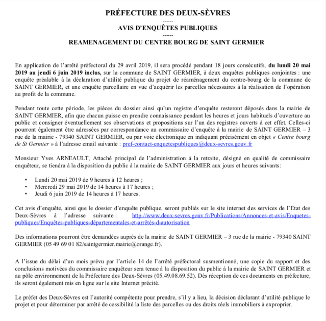 Deux enquêtes publiques vont être organisées à Saint-Germier pendant 18 jours consécutifs du lundi 20 Mai au jeudi 6 Juin 2019 relativement au projet de création de coeur de bourg. Les propositions et observations de la population pourront être consignées :