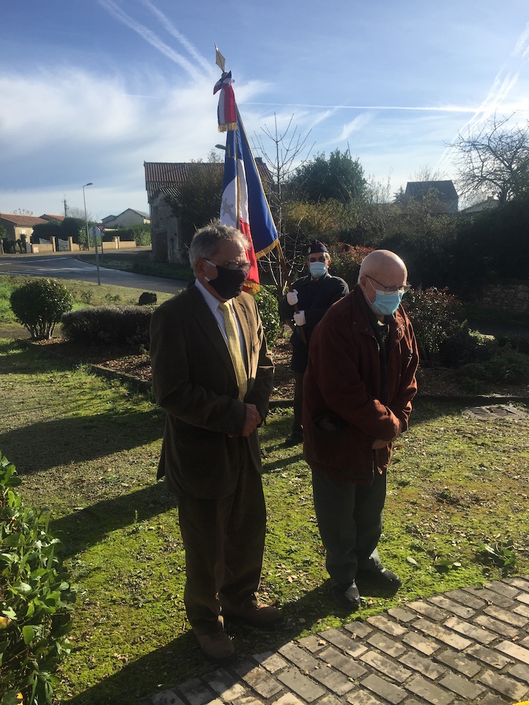 Monsieur le maire et Fernand Chaigne devant le monument aux morts.