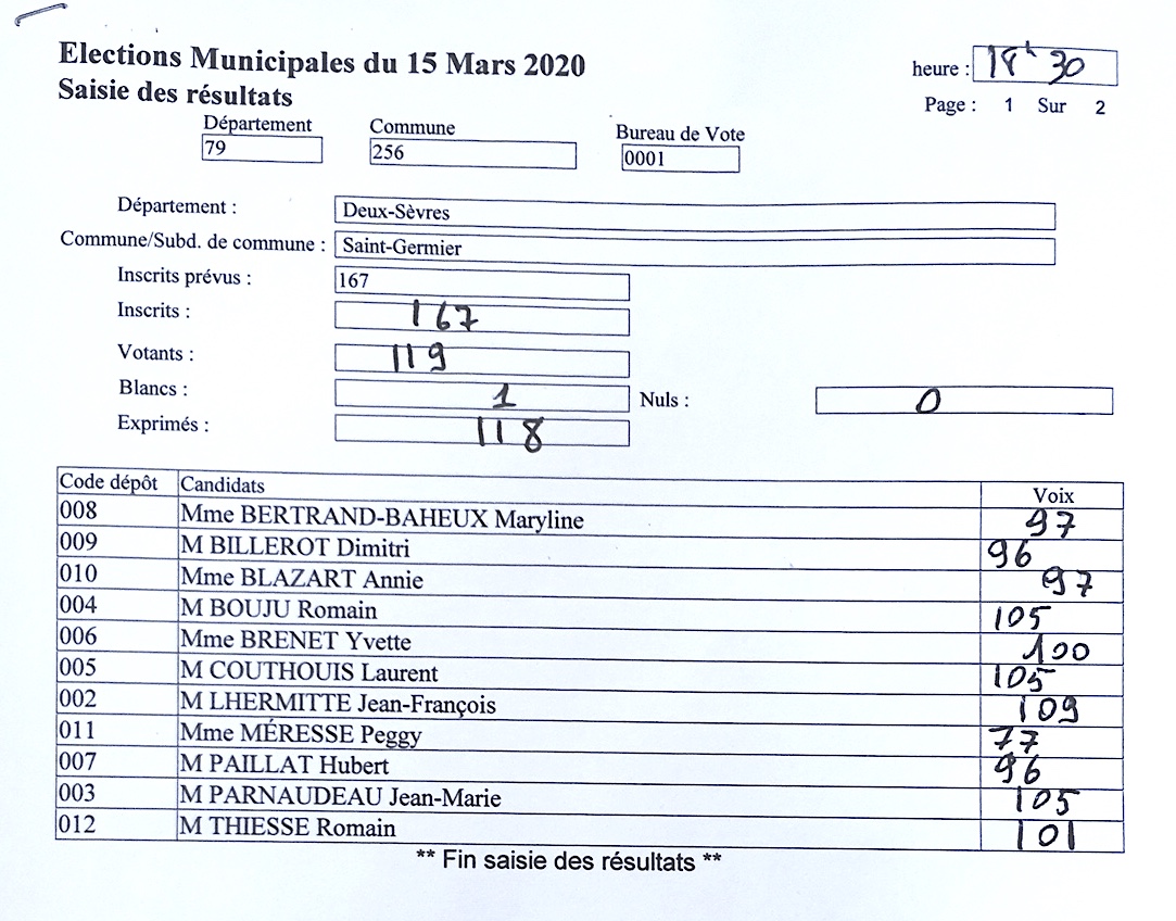 Le premier tour des élections municipales de Saint-Germier est clos. L’unique liste Ruralité dynamique conduite par Jean-François Lhermitte est élue dans son intégralité. Sur les 167 votants inscrits, 119 se sont rendus aux urnes ramenant à 71,26 % le taux de participation, un record compte tenu du contexte très particulier et du taux d’abstention au niveau national.