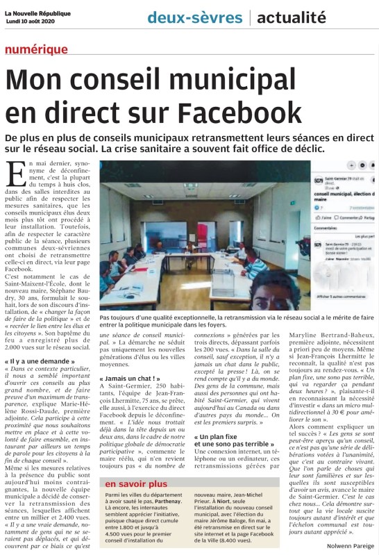 La démarche de communication et d’ouverture de la commune est mise en avant dans les pages départementales du journal la Nouvelle République qui est paru hier, lundi 10 Août. Monsieur le maire est en effet interrogé par la journaliste sur la question spécifique des conseils municipaux diffusés en direct grâce à l’application Live proposée par Facebook.