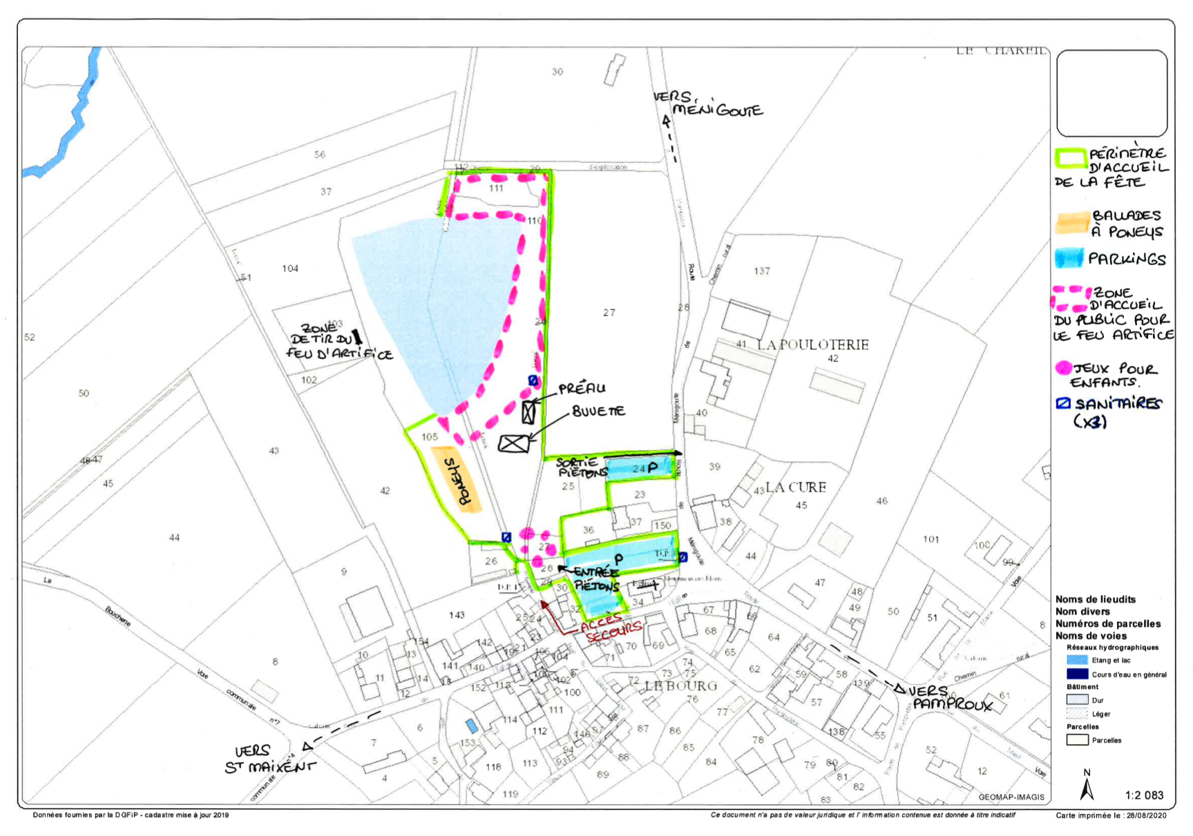 Des flacons de gel hydroalcoolique seront installés sur différents points du site ainsi qu’un rappel des règles sanitaires. Le port du masque sera obligatoire lors du feu d’artifice qui sera tiré en soirée. Le plan des animations figure ci-dessous avec également les ENTRÉE et SORTIE mises en place pour le feu d’artifice seulement comme souhaité par les services préfectoraux.