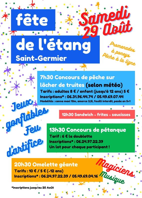 La fête de l’étang de Saint-Germier est à ce jour maintenue avec un programme cumulant animations pour les enfants et les adultes, musique ainsi qu’un feu d’artifices à la tombée de la nuit. Plusieurs nouveautés viennent agrémenter l’édition 2020.