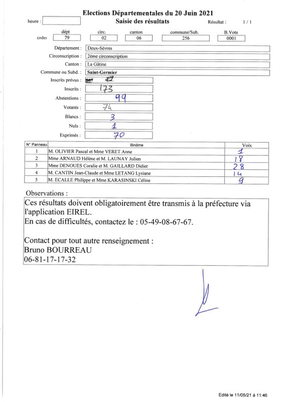 Ci-dessous les tableaux des résultats du 1er tour des élections départementales et régionales sur la commune de Saint-Germier. Le second tour aura lieu dimanche 27 juin de 8h à 18h à la salle des fêtes. Se munir de sa pièce d’identité et de sa carte d’électeur.