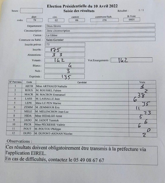 Le dépouillement du premier tour du scrutin de l’élection présidentielle 2022 à Saint-Germier donne les résultats suivants. 142 germariens sur 175 se sont présentés au bureau de vote ce jour :