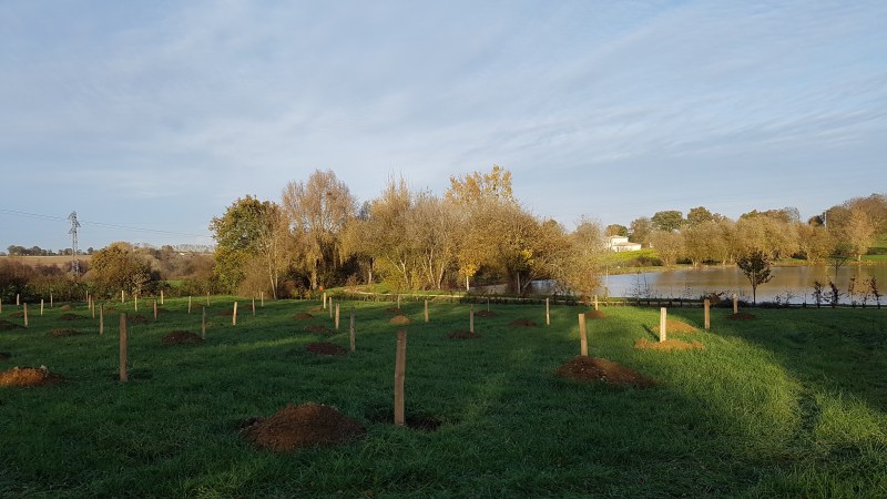 Les alignements et les trous sont faits, les piquets sont plantés. Les arbres arrivent le vendredi 9.