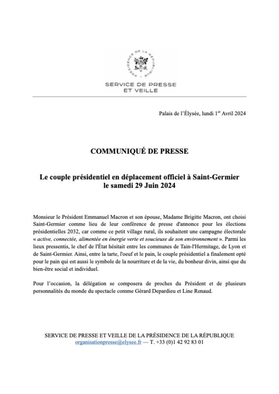 « Monsieur le Président Emmanuel Macron et son épouse, Madame Brigitte Macron, ont choisi Saint-Germier comme lieu de leur conférence de presse d’annonce pour les élections présidentielles 2032, car comme ce petit village rural, ils souhaitent une campagne électorale `active, connectée, alimentée en énergie verte et soucieuse de son environnement‘. Parmi les lieux pressentis, le chef de l’État hésitait entre les communes de Tain-l’Hermitage, de Lyon et de Saint-Germier. Ainsi, entre la tarte, l’oeuf et le pain, le couple présidentiel a finalement opté pour le pain qui est aussi le symbole de la nourriture et de la vie, du bonheur divin, ainsi que du bien-être social et individuel.«