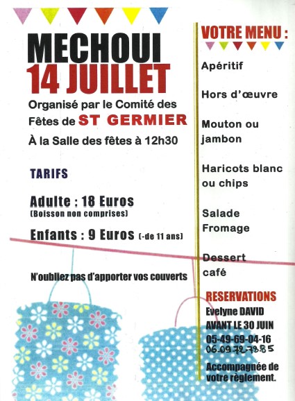 Dans un peu plus d’un mois se tiendra le méchoui du 14 juillet ! Le comité des fêtes de Saint-Germier est déjà à pied d’oeuvre pour la préparation de cette journée festive qui réunit habitants, amis, famille et toute personne qui voudrait passer un moment sympathique et convivial.
