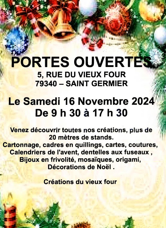 L’association Les Créations du Vieux Four organise une journée Portes Ouvertes le samedi 16 novembre de 9h30 à 17h30 au 5 rue du vieux four à Saint-Germier. Les organisateurs présenteront plus de 20 mètres d’œuvres comme des cartes, bijoux, mosaïques et autres calendriers de l’avent…