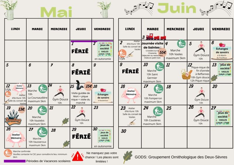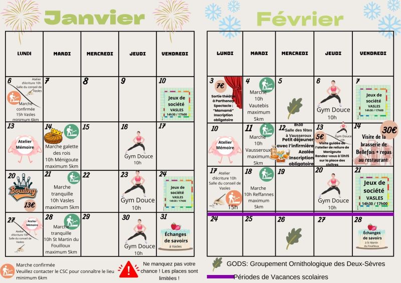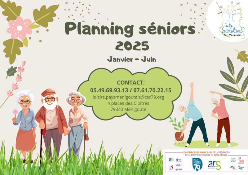 Voici une des bonnes résolutions de cette nouvelle année 2025 : participer aux sorties et animations proposées par le centre socio-culturel du pays Ménigoutais. On vous partage le programme du premier semestre à destination des séniors et concocté par Guillaume Thouin, référent au sein du CSC. Chaque semaine, il est possible de faire du sport, se cultiver, s’amuser ou se régaler. De nombreuses sorties sont gratuites et d’autres sont payantes comme la sortie bowling du lundi 20 janvier ou la visite de la Brasserie de Bellefois le vendredi 14 février. Les activités commencent dès le lundi 6 janvier avec un atelier d’écriture à la salle du conseil de la mairie de Vasles dès 10h et une marche confirmée (6 km minimum) au départ de cette même commune à 15h.