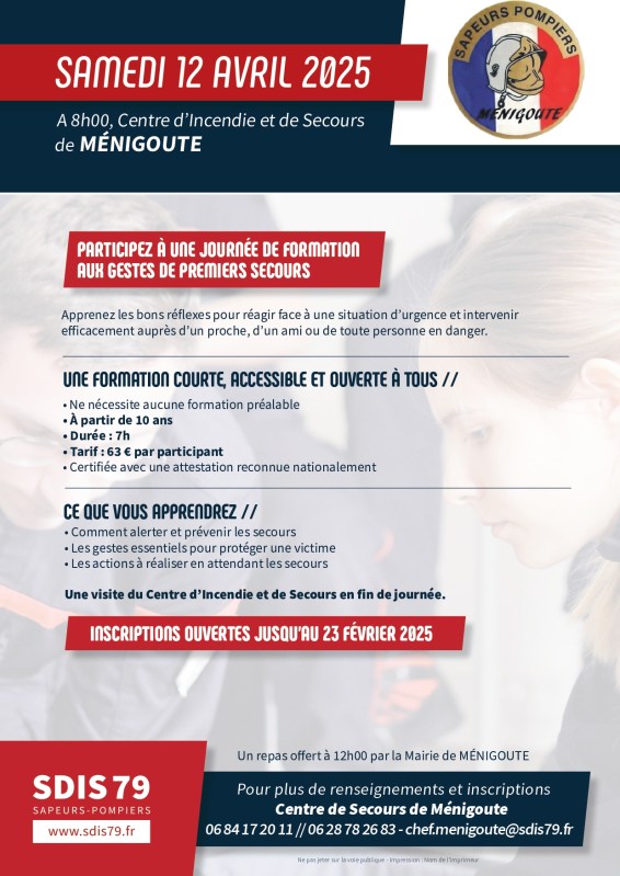 Pour plus de renseignements et inscriptions, contactez le Centre de Secours de Ménigoute au 06 84 17 20 11 ou 06 28 78 26 83, ou par email à chef.menigoute@sdis79.fr.