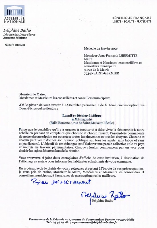 Madame Delphine Batho, députée des Deux-Sèvres et ancienne ministre, a informé le maire et ses conseillers par une lettre en date du 22 janvier 2025, de la tenue prochaine d’une Assemblée permanente à la salle romane de Ménigoute, lundi 17 février à 18h30.