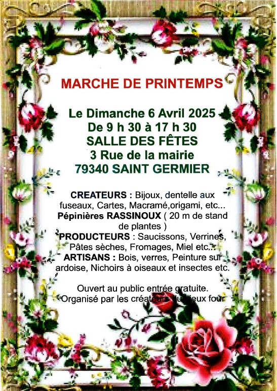 L’association les « Créations du vieux four » organise une journée de vente à la salle des fêtes de Saint-Germier le dimanche 6 avril à partir de 9h30. Ce marché de printemps sera l’occasion de découvrir des réalisations originales : bijoux, dentelle au fuseaux, cartes ou macramés. Vingt mètres de stand seront dédiés aux plantes des pépinières Rassinoux et plusieurs producteurs et artisans proposeront des produits locaux : saucissons, fromages, miel, bois, peinture et nichoirs à oiseaux et insectes (…).