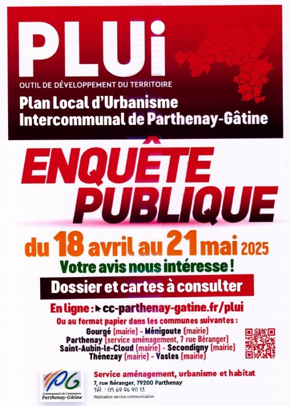 - sur support papier et sur un poste informatique au service aménagement du territoire, urbanisme et habitat de la CCPG, situé 7 rue Béranger à Parthenay,