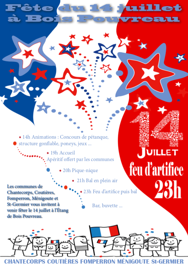Les communes de Chantecorps, Coutières, Fomperron, Ménigoute et Saint-Germier s’unissent pour les festivités du 14 Juillet pour la 3ème année consécutive ! Le public est attendu sur le site de Bois Pouvreau où se tiendront des jeux et des animations l’après-midi. Un apéritif sera offert par les cinq communes vers 19h et sera suivi d’un pique-nique sorti du […]