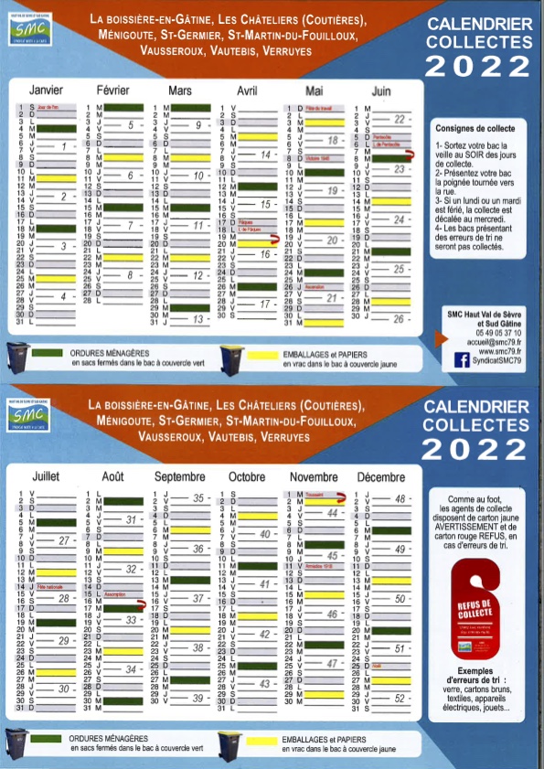 Le calendrier de collectes du SMC 79 (Syndicat Mixte à la Carte) est désormais disponible en ligne. La version papier est distribuée aux habitants et reste également consultable à tous moments sur votre site internet sur la page Collecte des déchets.