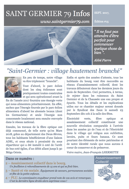 Saint-Germier : village hautement branché En peu de temps, notre village va être triplement « branché ». Tout d’abord, le parc éolien dont les cinq éoliennes sont pratiquement toutes construites et qui sera opérationnel avant la fin de l’année 2017 fournira une énergie verte qui nous alimentera prioritairement. En effet, sachez que l’énergie fournie par le parc […]