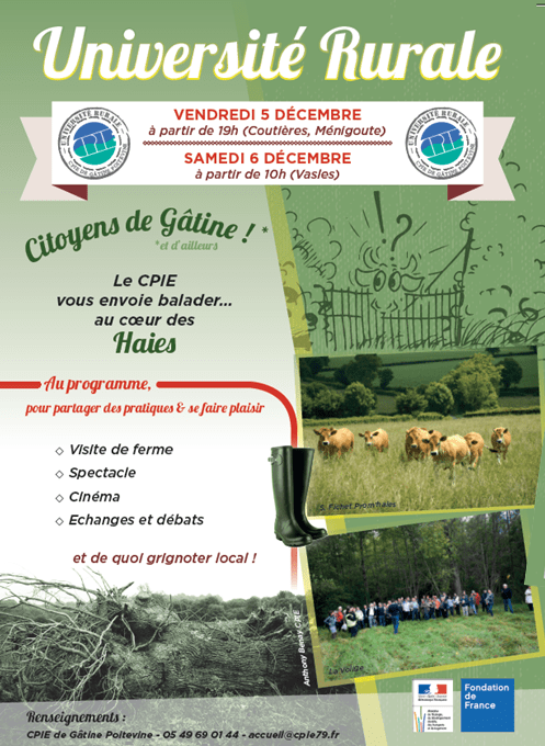 Vendredi 5 et samedi 6 décembre, le CPIE de Gâtine Poitevine organise un moment fort de l’Université Rurale, une université sans murs, les pieds dans la bottes… Au programme, des animations, découvertes et débats autour du thème de la Préservation des haies bocagères avec : Visite de ferme, Spectacle, Cinéma, Échanges et débats… et de […]