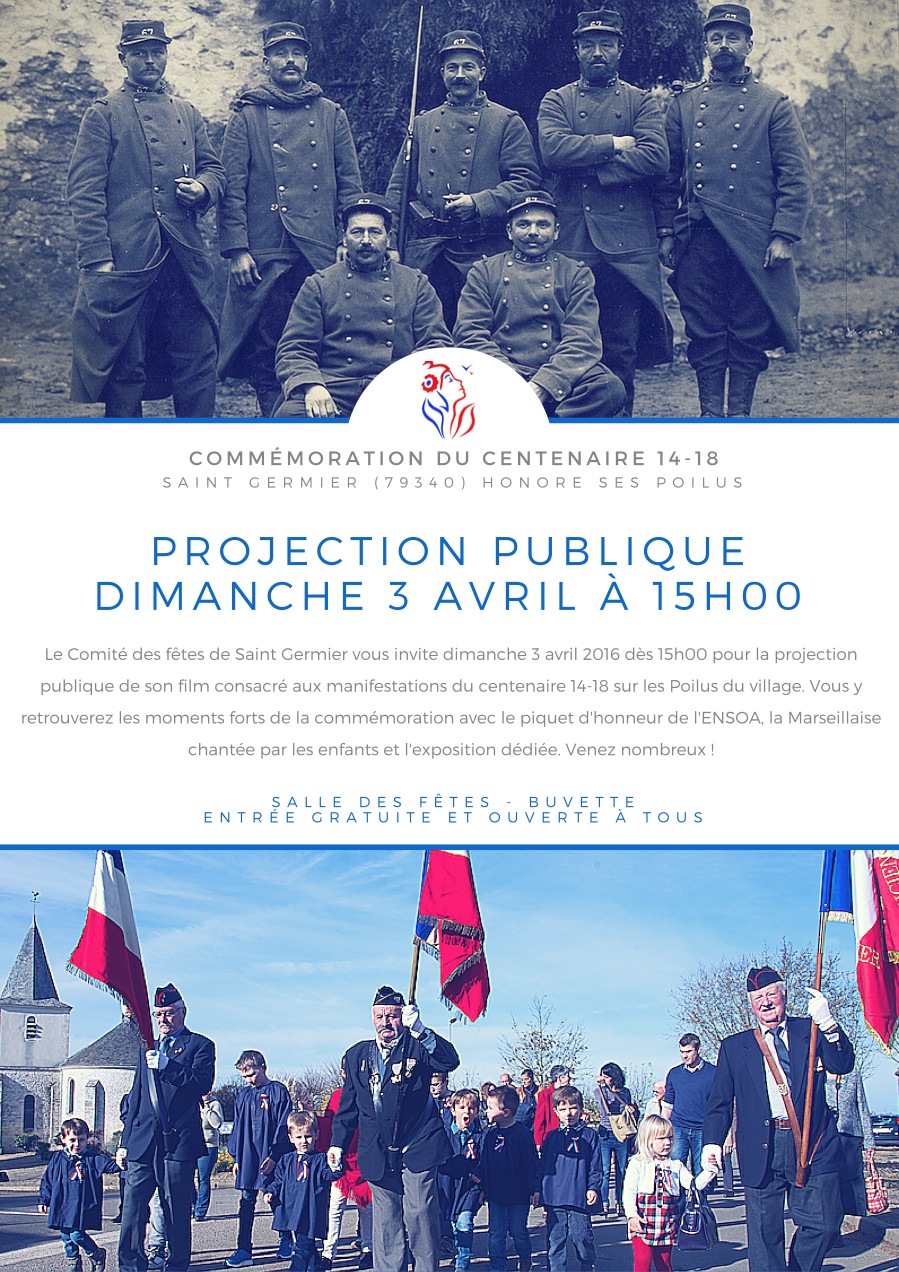 Le Comité des fêtes de Saint Germier vous invite dimanche 3 avril 2016 dès 15h00 pour la projection publique de son film consacré aux manifestations du centenaire 14-18 sur les Poilus du village. Vous y retrouverez les moments forts de la commémoration avec le piquet d’honneur de l’ENSOA, la Marseillaise chantée par les enfants et […]