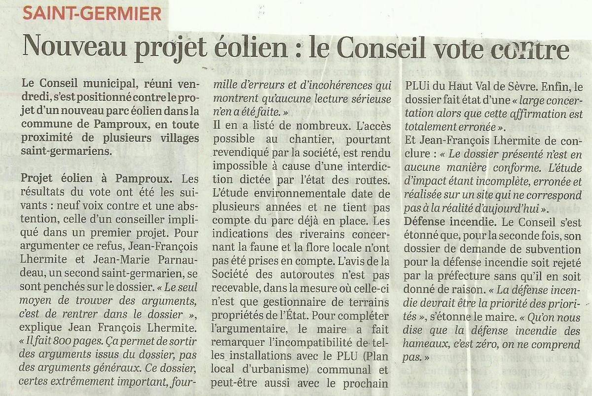 20190916-Courrier-Le conseil vote contre le projet éolien de Pamproux