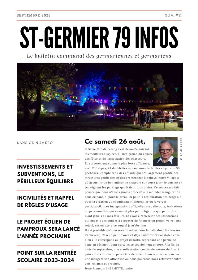 Le bulletin communal de septembre est en ligne. Au sommaire : le retour en images de la fête de l’étang, les investissements et subventions, un rappel des règles d’usage, le projet éolien de Pamproux et un point sur la rentrée scolaire.