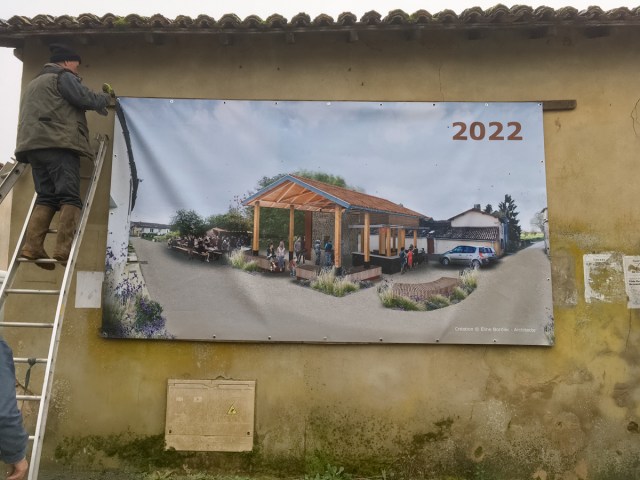 Une reproduction en grand format du projet de la halle du futur coeur de bourg a été installée sur le bâtiment concerné et est visible depuis la rue de l’église.