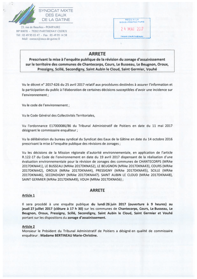 Vous trouverez dans le document ci-dessous l’arrêté de mise à l’enquête publique concernant la révision du zonage d’assainissement sur le territoire des communes de Chantecorps, Cours, Le Busseau, Le Beugnon, Oroux, Pressigny, Scillé, Secondigny, Saint-Aubin le Cloud, Vouhé et bien-sûr Saint-Germier. L’enquête publique sera ouverte du lundi 26 Juin 2017 dès 9h au jeudi 27 […]
