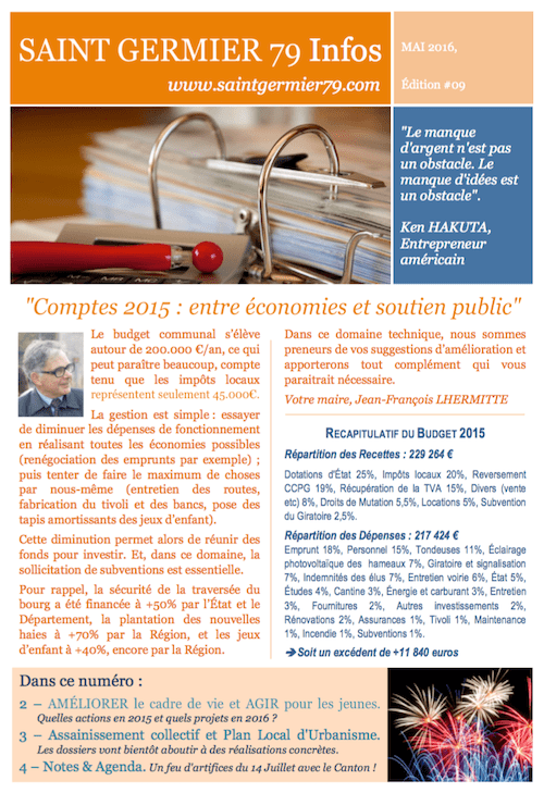 Nous vous invitons à consulter le dernier bulletin communal SG79 Infos #09. Celui-ci est particulièrement orienté sur les comptes 2015 compte vous le verrez ci-dessous dans l’édito du maire : Le budget communal s’élève autour de 200.000 €/an, ce qui peut paraître beaucoup, compte tenu que les impôts locaux représentent seulement 45.000€. La gestion est […]