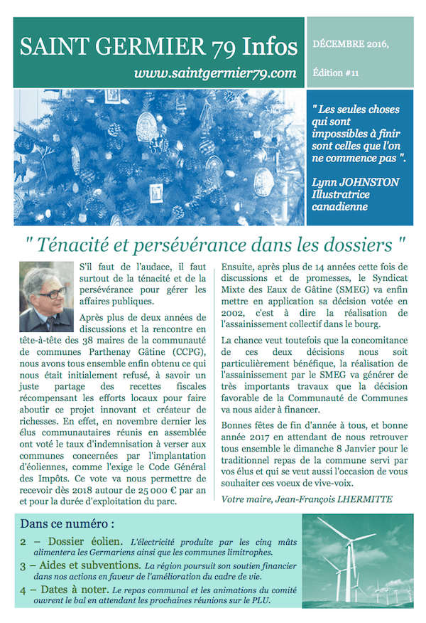Des chantiers entre vent, eau et paysage Si notre village se transforme petit à petit tous les jours, l’année 2017 sera sûrement un moment important, marquée par trois événements majeurs : durant l’été 2017, les cinq éoliennes de la plaine Boucard seront dressées, à l’automne débuteront les travaux pour l’assainissement collectif du bourg, travaux qui […]