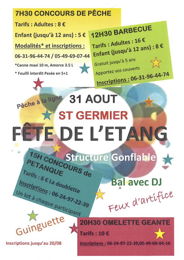 Plus qu’une semaine avant la première FÊTE DE L’ÉTANG organisée par la commune de Saint-Germier et en collaboration avec les trois associations du village : le comité des fêtes et les associations de pêche et de chasse. Au programme : concours de pêche et de pétanque, animations pour les enfants, bal, DJ, jeu gonflable géant […]