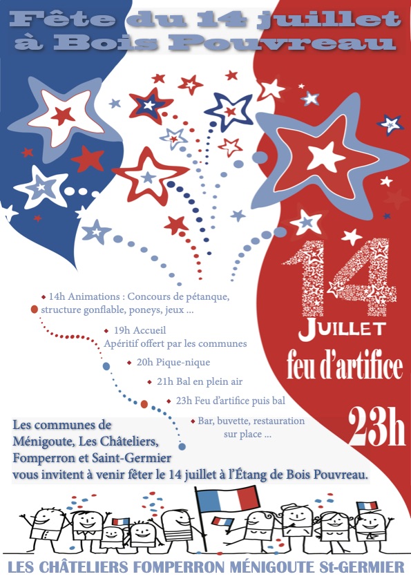 Les communes de Ménigoute, Les Châteliers, Fomperron et Saint-Germier vous invitent de nouveau à venir fêter le 14 juillet à l’Étang de Bois Pouvreau avec un programme riche en animations !