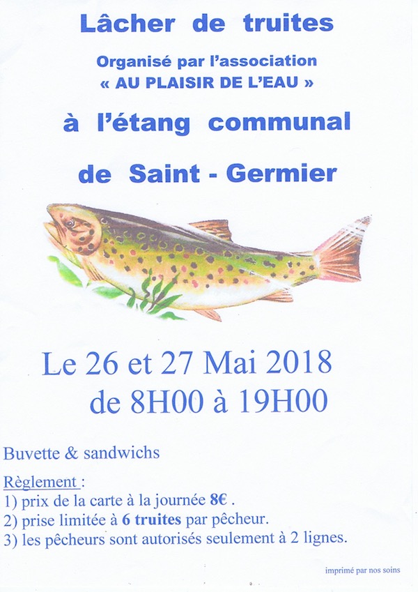 L’association Au Plaisir de l’eau accueille tous les pêcheurs pour son prochain lâcher de truites à l’étang de Saint-Germier les 26 et 27 Mai prochains de 8h à 19h. Une buvette et un service de restauration légère (sandwiches) sont prévus. Règlement : 8€ (carte à la journée), Prise limitée à 6 truites par pêcheur, Deux […]