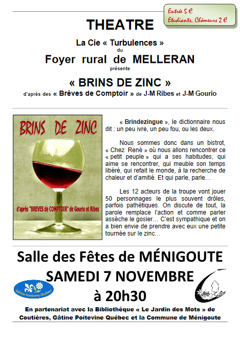 La bibliothèque de Coutières « le jardin des mots » et l’association Gâtine Québec, en partenariat avec la commune de Ménigoute, accueillent la Cie « Turbulences » le samedi 7 Novembre. Le spectacle se passe dans un bistrot où 12 acteurs jouent le rôle de 50 personnages, le plus souvent drôles et parfois pathétiques. C’est sympathique et on a bien envie […]